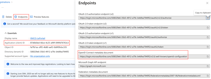 - Click the Endpoints button and note the URL for OpenID Connect metadata document. These informations will need to be provided to our teams.