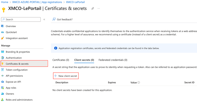 - In the Microsoft menu, navigate to Certificates & secrets