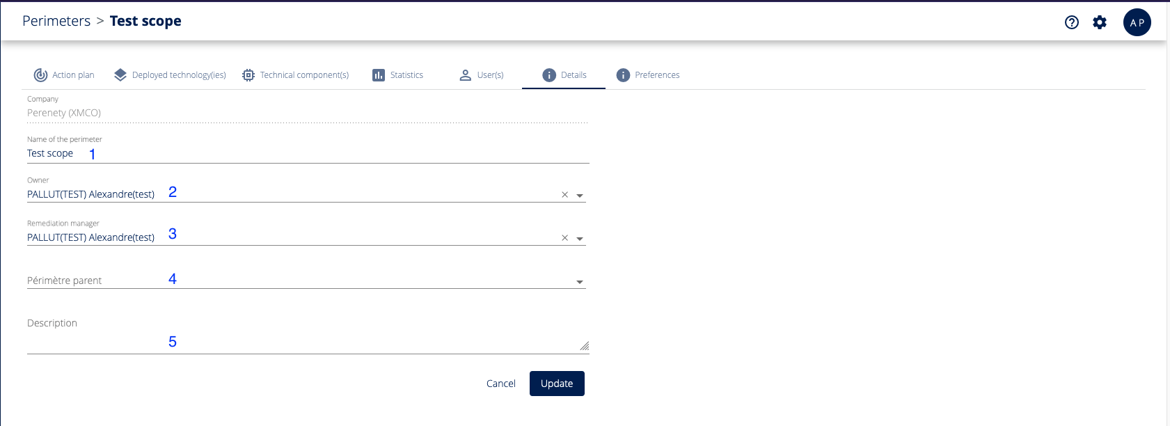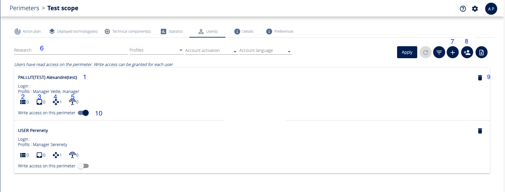 This tab groups together all the characteristics of the scopes related to the users associated with the perimeter.