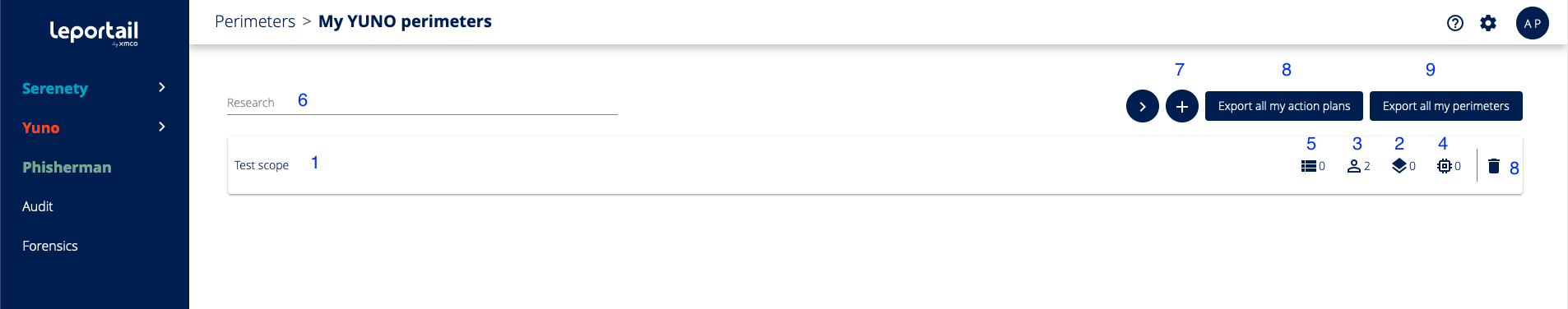 The My Yuno perimeters page only displays the perimeters that you, as a user, have the right to view.