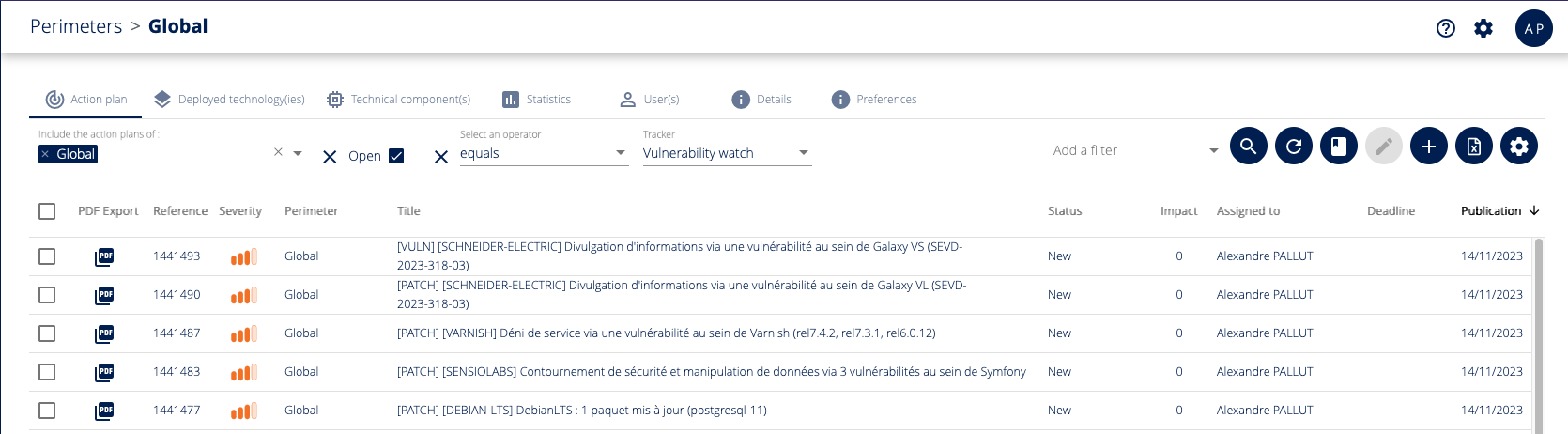 9. export the list of action plans : you will recover an excel file containing all the action tickets associated with your perimeters (one tab per scope).