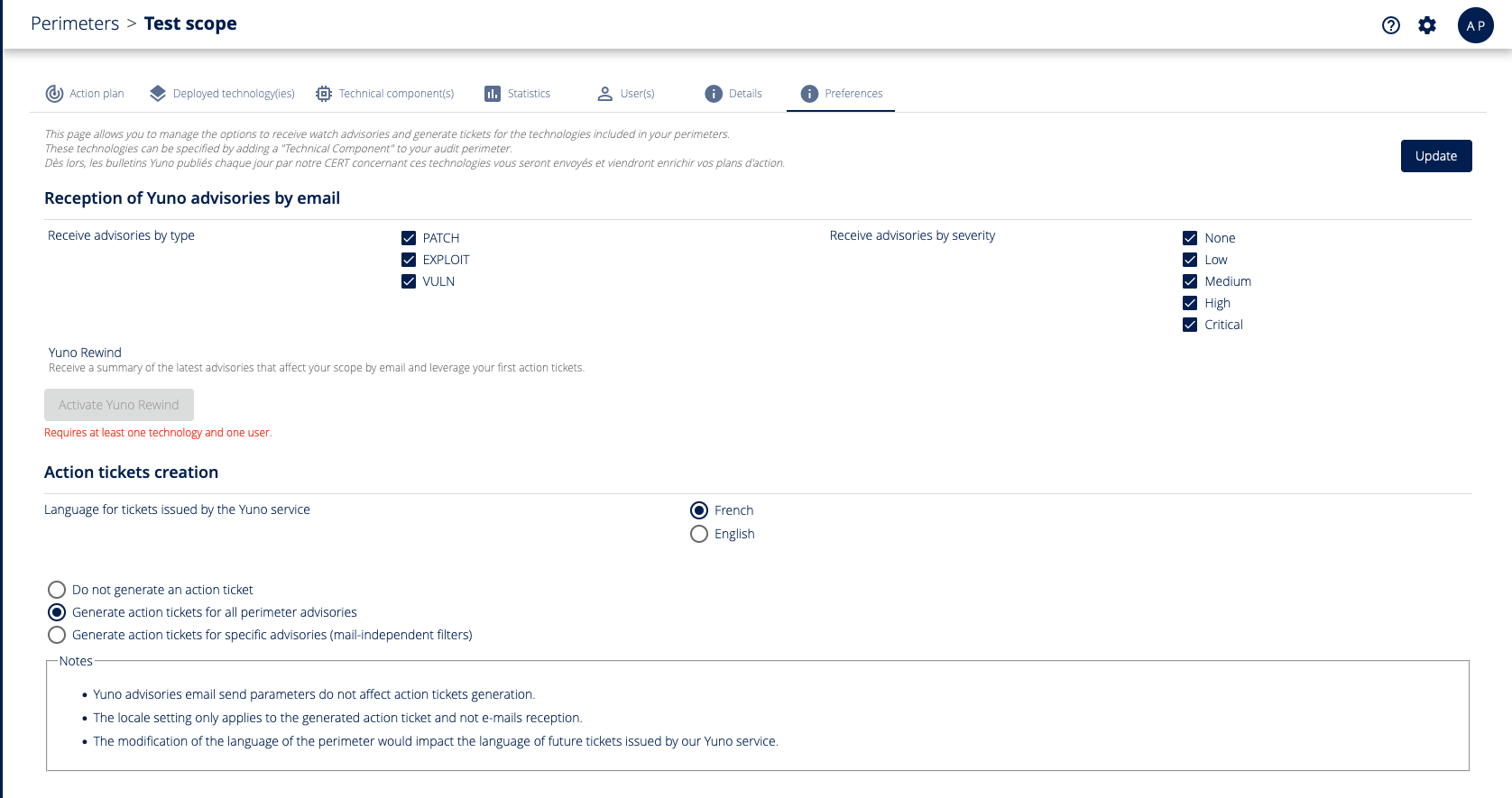 The Preferences tab is used to set up the association of bulletins with the scope and the generation of scope action tickets .