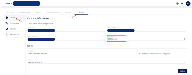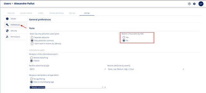 Click on the Preferences menu in the sidebar and activate the "Receive critical alerts by SMS" option. Click on "Update" to confirm the configuration.