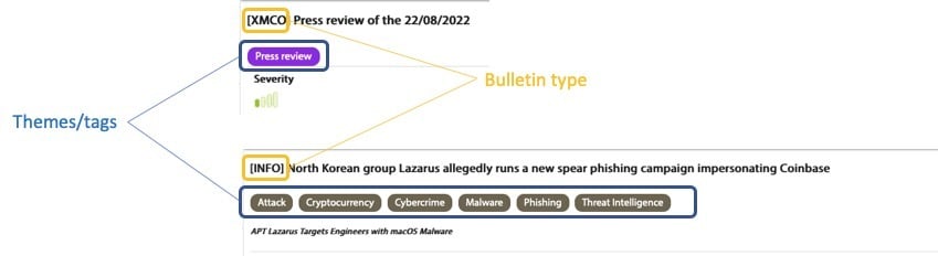 - If applicable, Themes associated with INFO bulletins (list of themes in the form of tags)