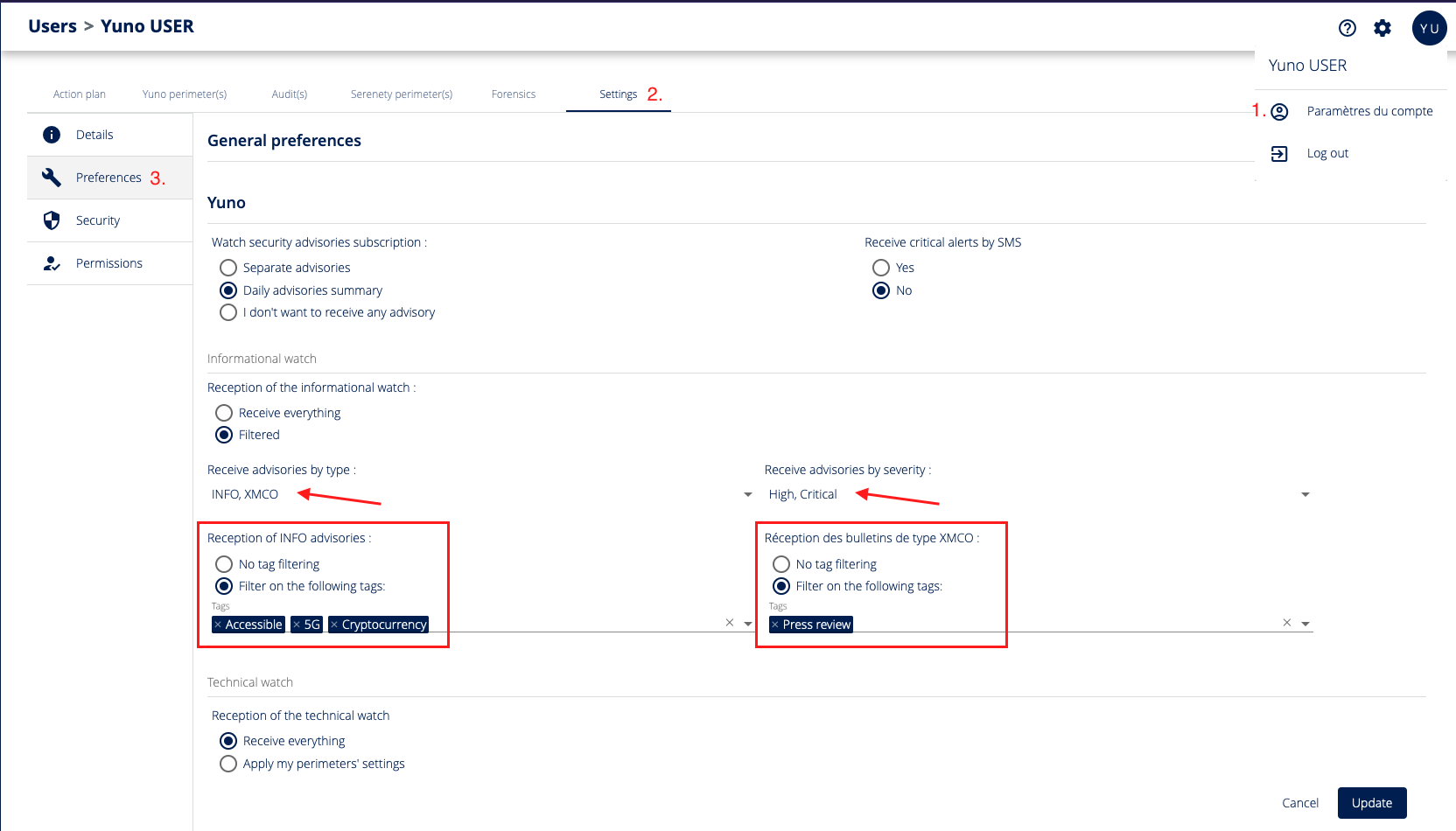 While technology watch is set at the level of a scope, an element common to several users, environmental watch is set directly at the level of user preferences.