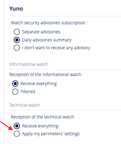 Then repeat the previous step to access the parameters for receiving cyber watch and select "Apply my perimeters' settings".