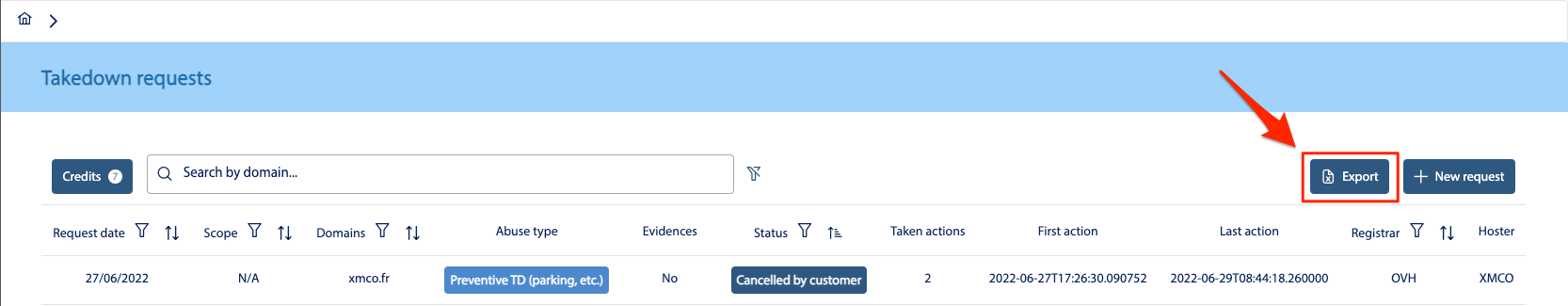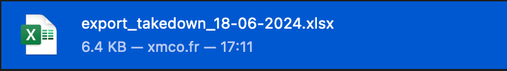 An export function for takedowns is available from the button at the top right. This feature allows you to obtain an Excel file containing the information below.