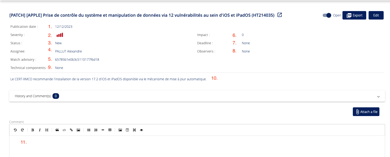 When a bulletin concerns a technical scope, we automatically create an action ticket within the scope's action plan. This action ticket serves as a reminder that an action needs to be taken (a patch to be applied, a vulnerability to be investigated, etc.) within the scope concerned.