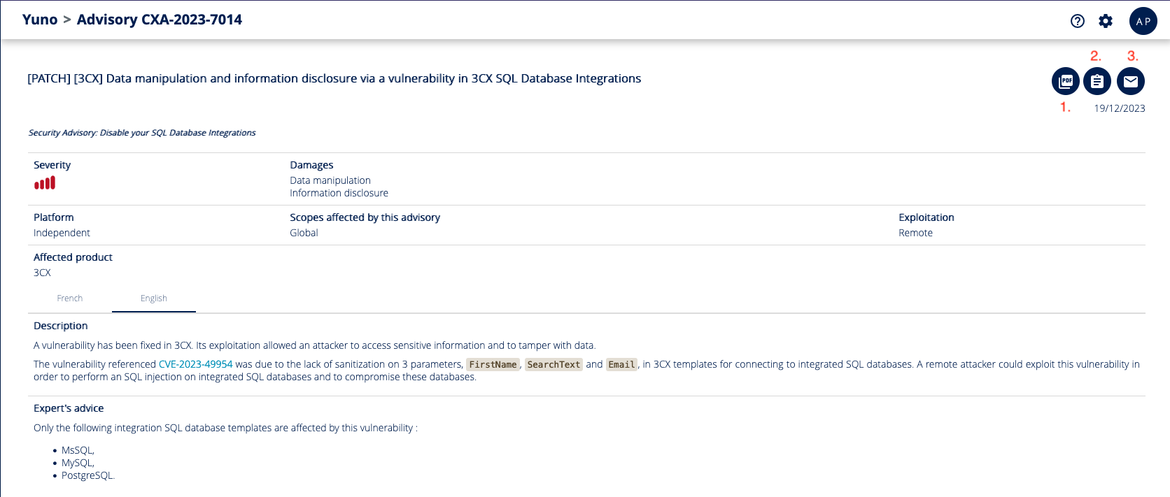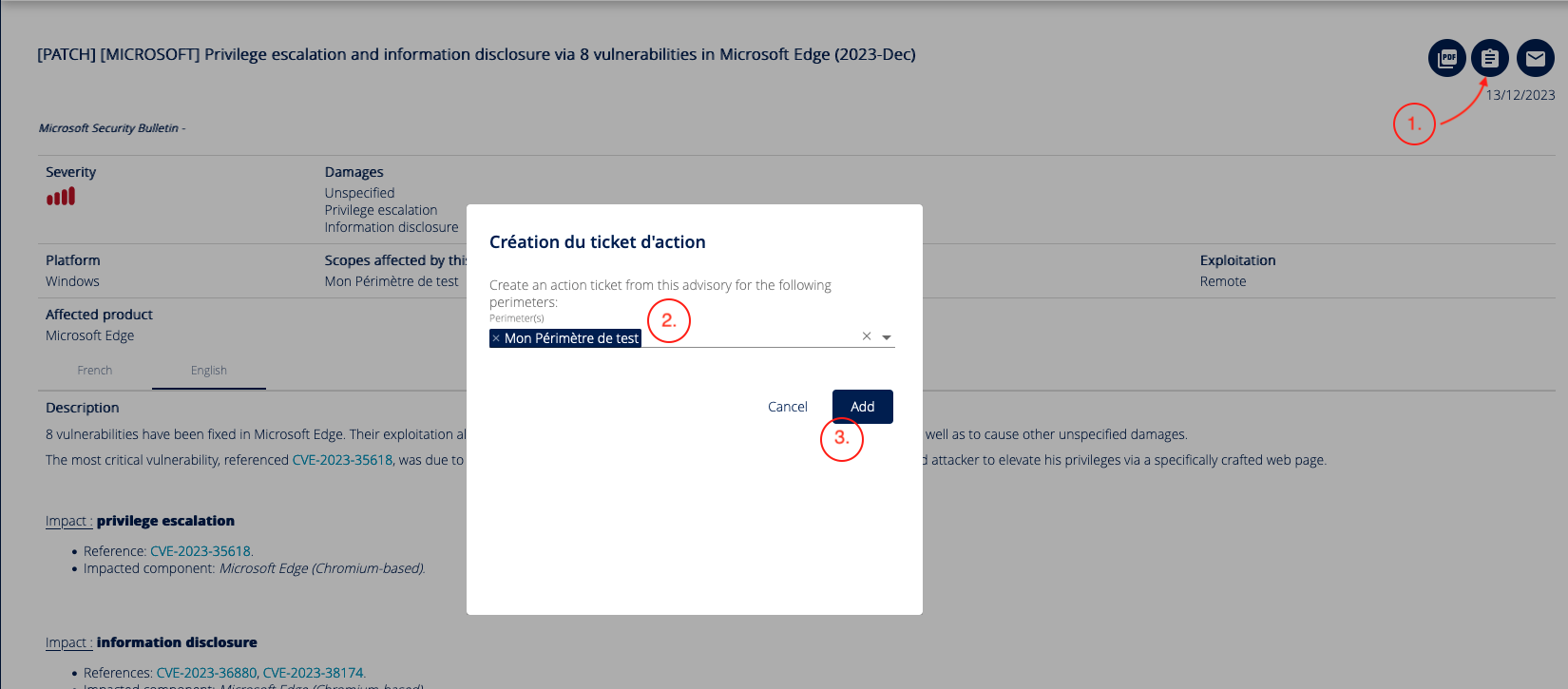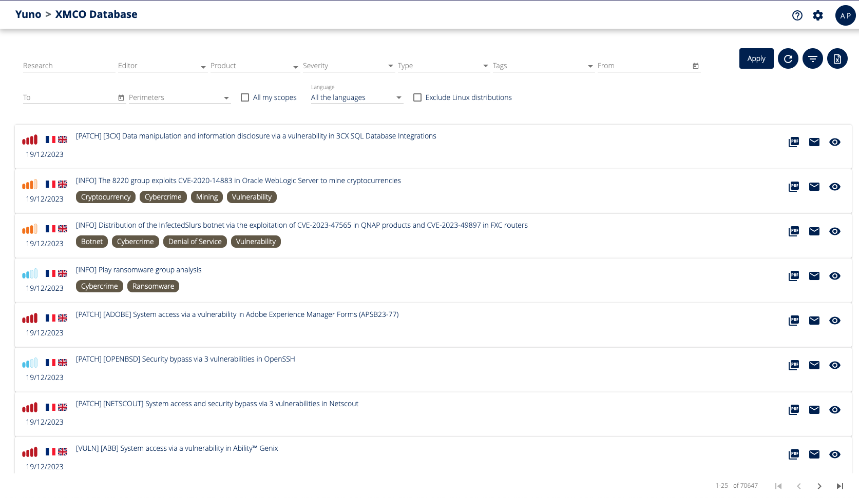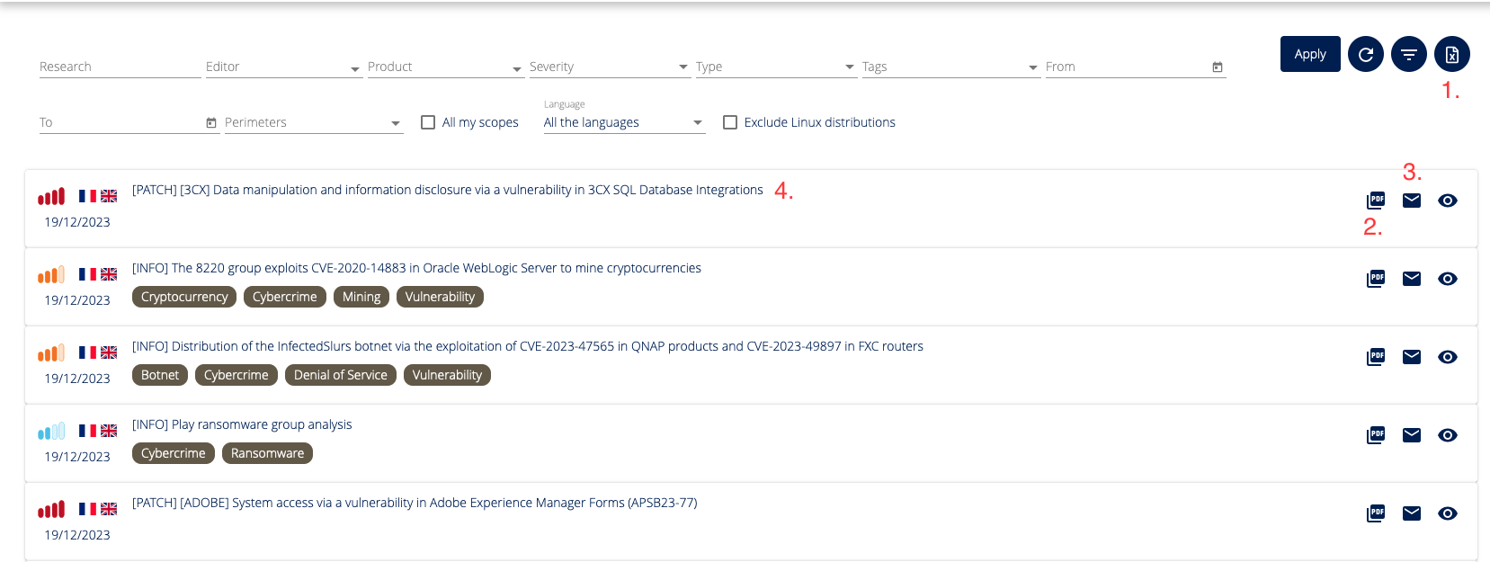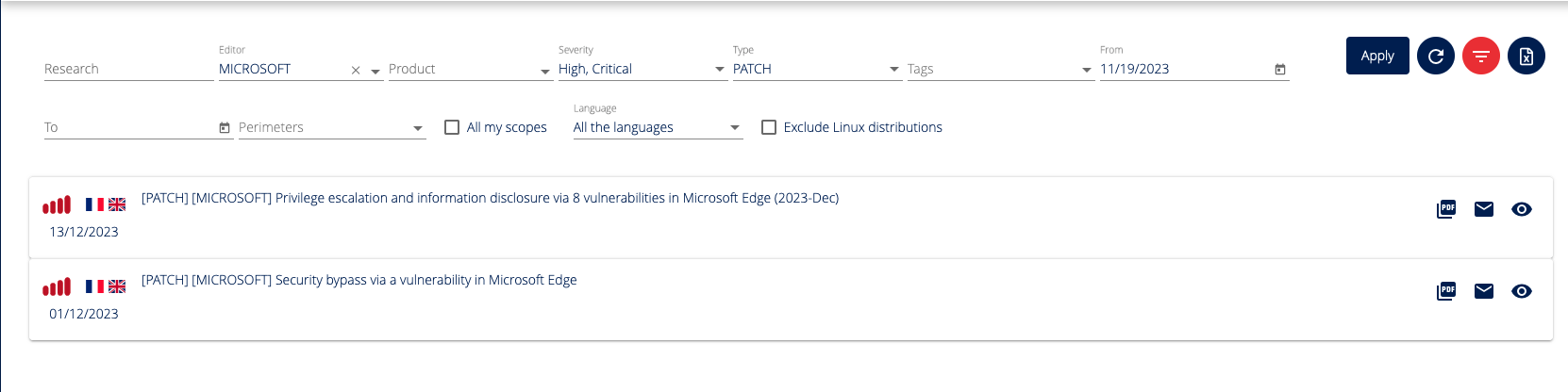 Use the "perimeter" filter to keep the bulletins that meet the criteria of the technologies included in the selected scope.