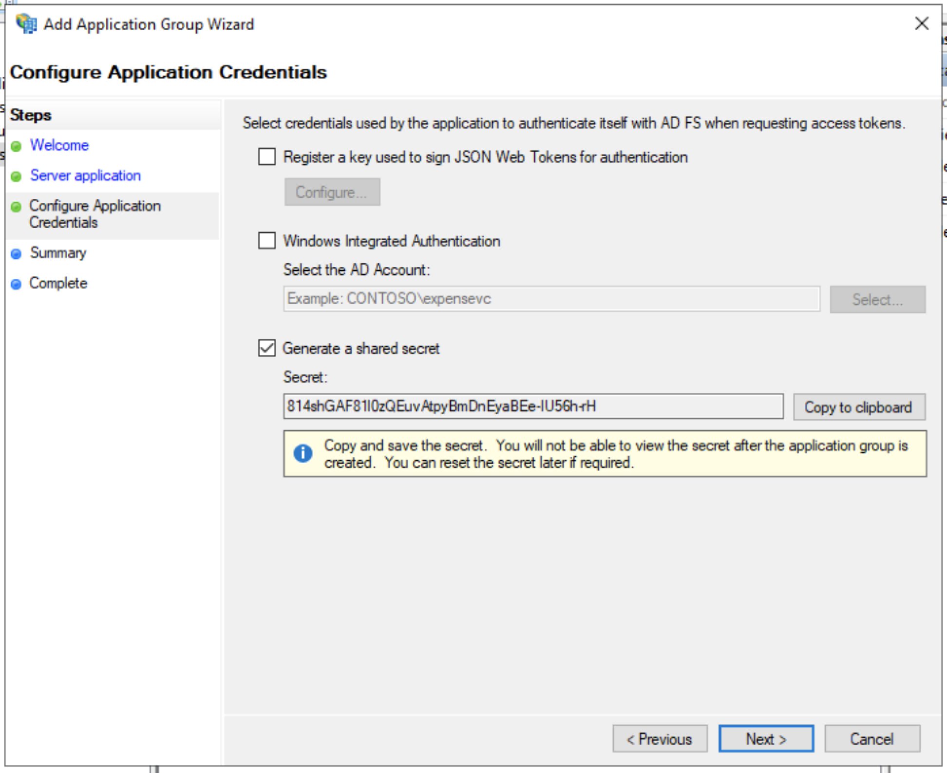 - Copier et noter la valeur du champ Secret. Il s'agit du Client Secret qui sera à fournir à nos équipes.