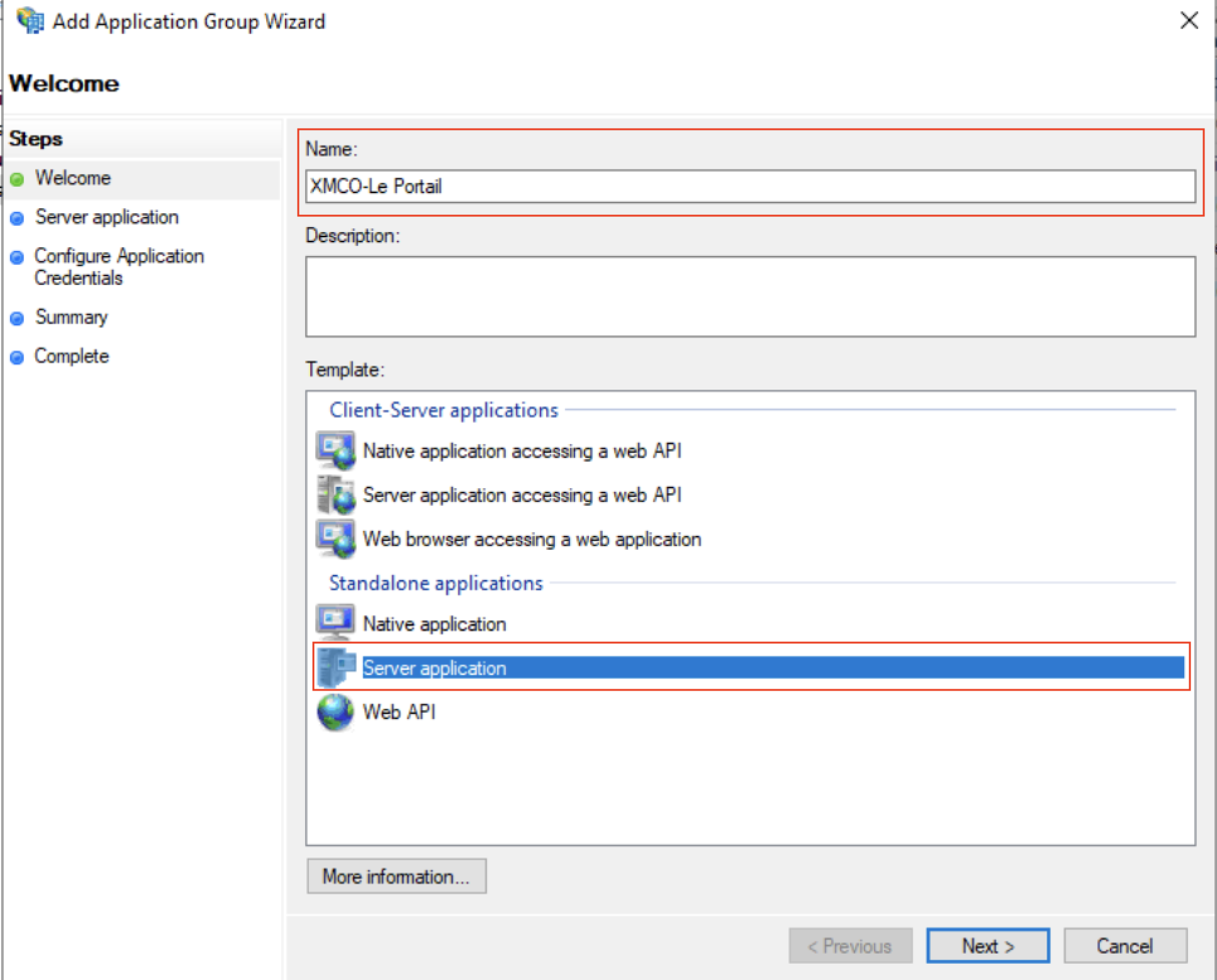 - Saisir le nom de l'application, par exemple XMCO-Le Portail