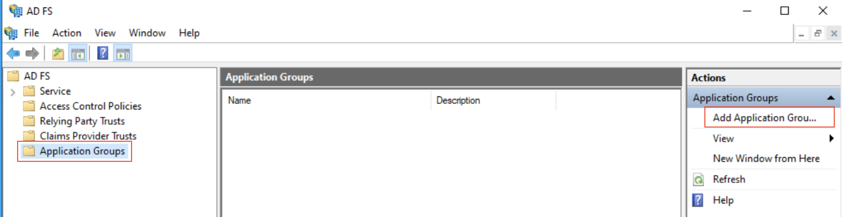 - Dans la console d'administration AD FS, naviguer dans le menu Application Groups