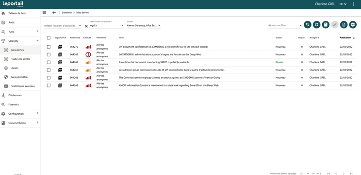 La page de visualisation de vos alertes vous permet d'identifier et de suivre les tickets d'actions envoyés par nos analystes. Elle est accessible depuis le menu à gauche, dans le module Serenety, sous le nom "Mes alertes" ou "Toutes les alertes" :
