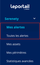 Pour accéder à cette page, cliquez sur Mes alertes ou Toutes les alertes depuis le menu Serenety :