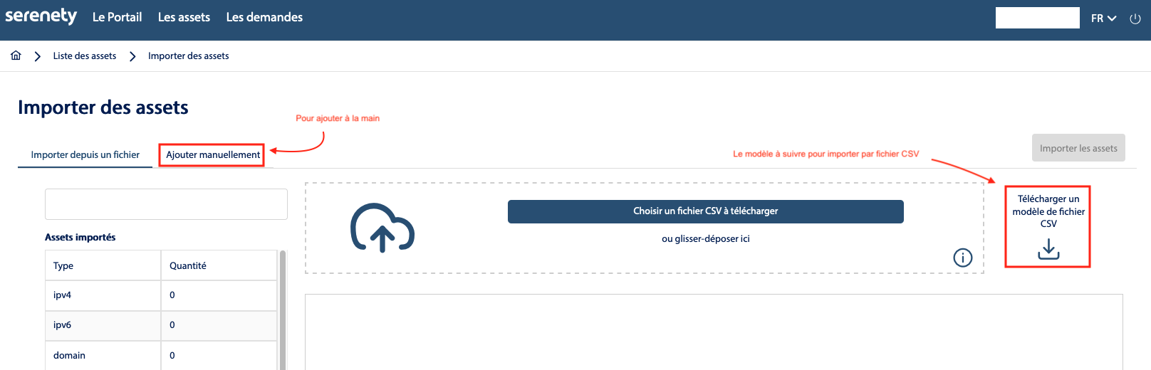 - Vous avez le choix entre importer des assets via un fichier CSV ou manuellement.