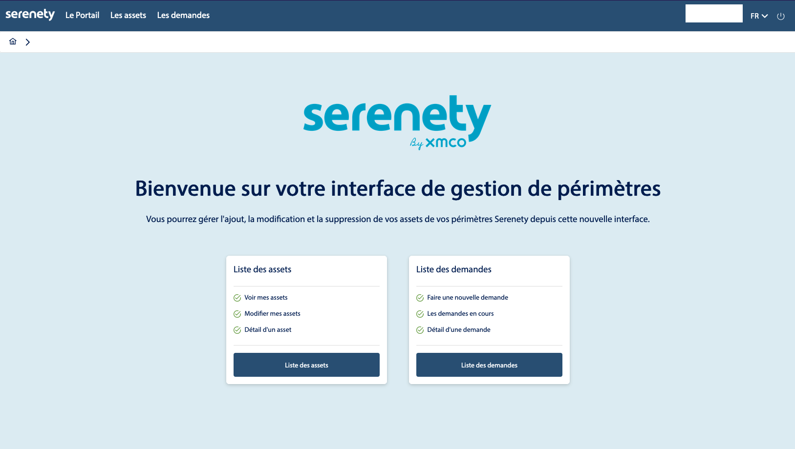 Vous arriverez sur l'interface de gestion de vos périmètres et vos assets.