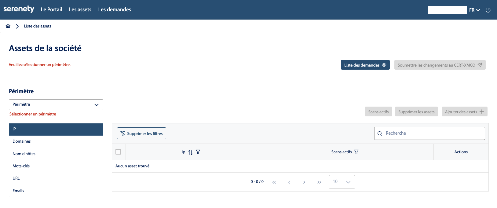 - Vous arrivez sur la liste de tout les assets de votre société. Celle-ci est vide, car il vous faut sélectionner un périmètre.