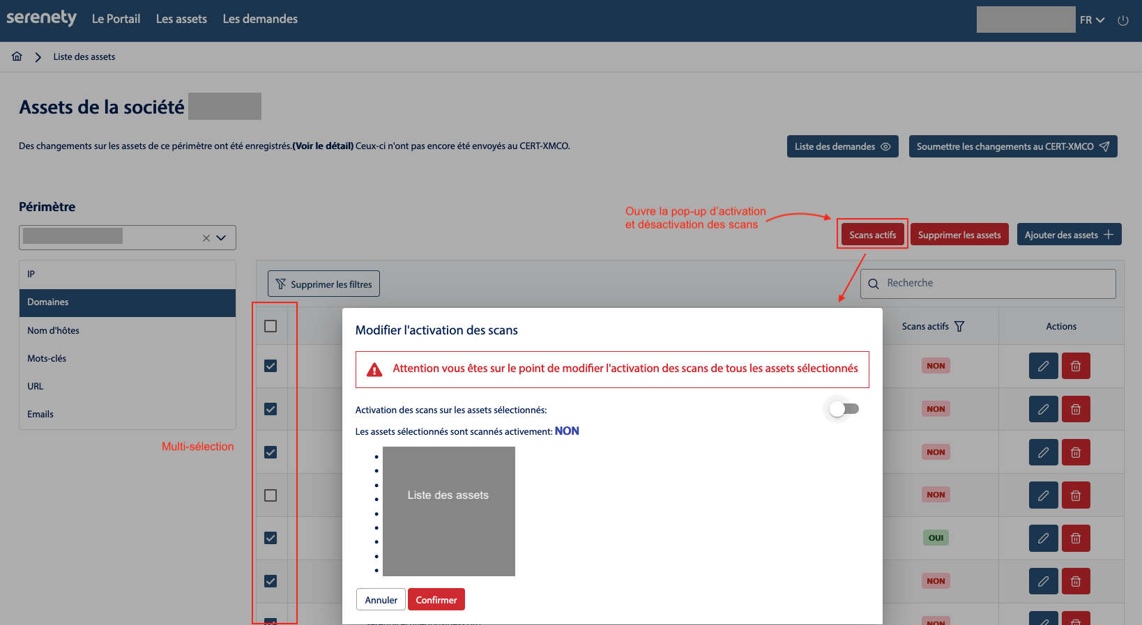 - Cliquer sur Liste des assets puis Sélectionner un périmètre de votre choix pour consulter la liste des assets associés.