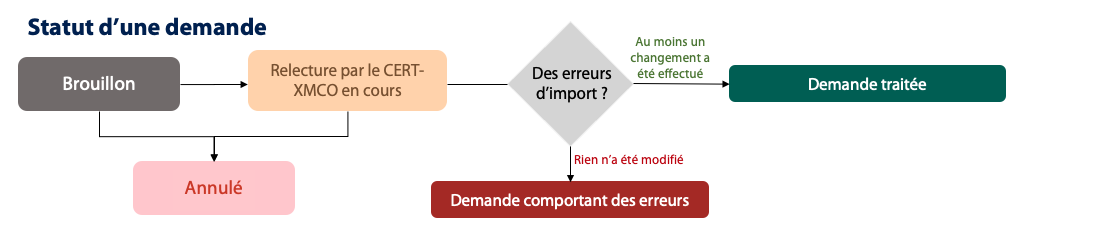 En cas d'erreurs dans l'import des changements demandés, le statut de la demande sera "Demande comportant des erreurs".
