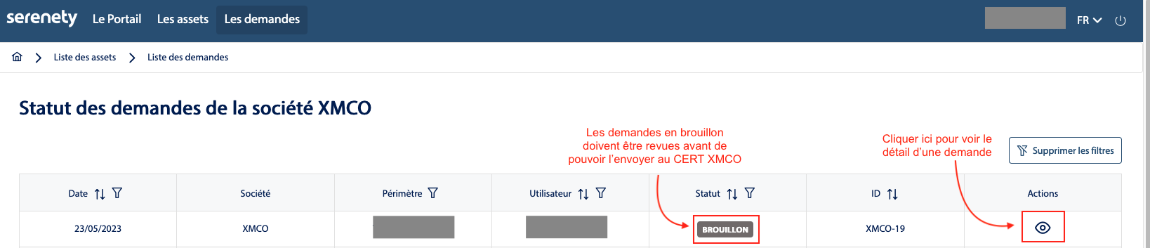 - Après vous être connecté sur le Portail, cliquer sur Mes assets depuis le menu Serenety, puis Liste des demandes.