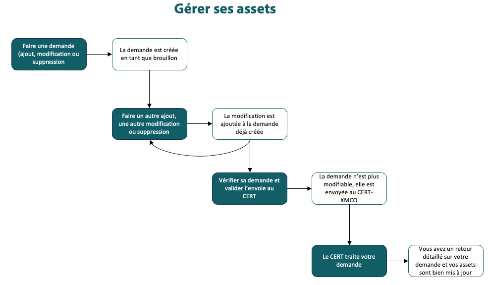 - Notre CERT peut alors traiter votre demande : soit valider soit refuser certains changements. Lorsqu'il a fini sa revue, vos assets seront mis à jour selon ce qui a été validé, et vous aurez accès à un retour détaillé sur votre demande (son nouveau statut sera alors "Demande Traitée")