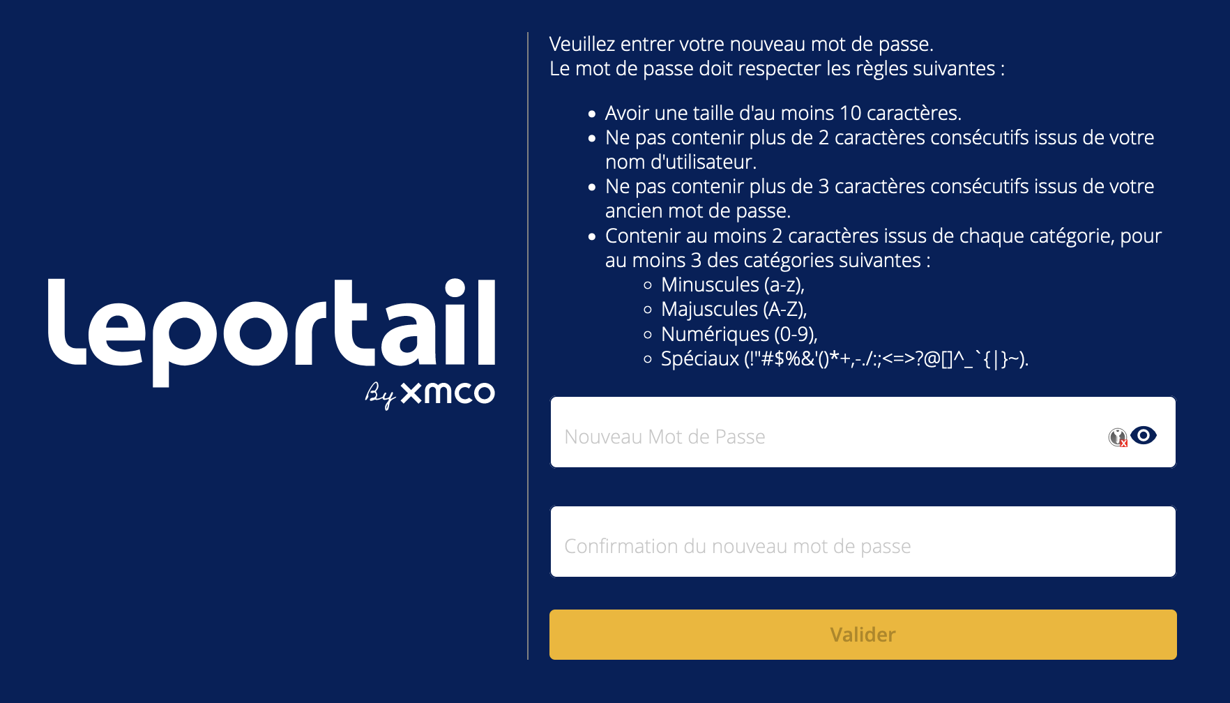 Tester l’accès au Portail (https://leportail.xmco.fr) avec votre identifiant (votre adresse email enregistré à la création du compte) et votre nouveau mot de passe.