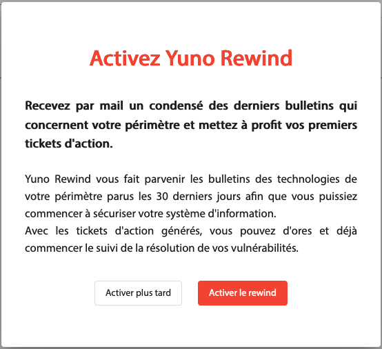 Une fois que vous avez associé au moins un utilisateur (propriétaire du périmètre compris) et une technologie à ce périmètre, une fenêtre contextuelle s'ouvre et vous proposant d'activer Yuno-rewind.