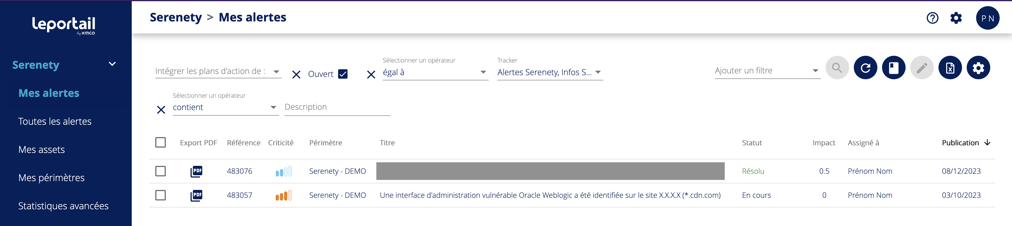 - l'export des alertes au format PDF (d'une alerte ou de plusieurs alertes sur la même page)